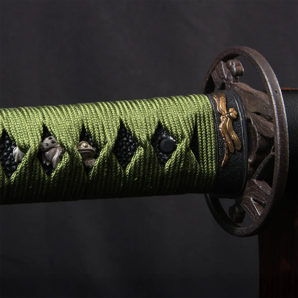 Inspired by the colors of early spring in Japan, it features rich, deep green accents complemented by playful frog and dragonfly motifs, details that evoke the gentle warmth and quiet life of a rice field as the season begins to turn. These traditional motifs add character without overwhelming the sword’s clean, composed presence.